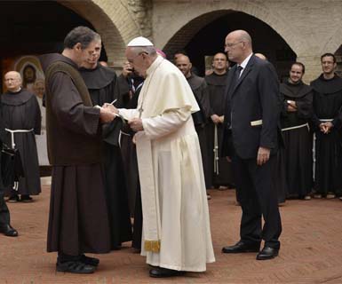 Giã từ những người nghèo tại tòa GM Assisi, ĐTC đã đến Vương cung thánh đường thánh Phanxicô lúc 10 giờ 20. Tại đây ngài được cha Tổng quyền dòng Phanxicô Viện tu cùng với cha Bề trên thánh tu viện tiếp đón. ĐTC đã chào thăm đông đảo các tu sĩ của dòng trong Thánh đường trên, trước khi đi xuống hầm đền thờ để quì cầu nguyện trước mộ của thánh Phanxicô.